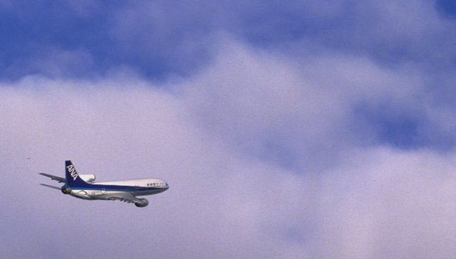 全日空 トライスター 千歳空港(旧ターミナル)から コメント:まるで模型のような写真。飛行機全体に光がきれいに まわっていて、雲もほどよくふんわりしている。 こんな日のフライトは気持ちがいいんだろうなぁ!