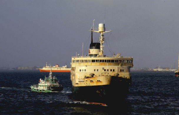 これからタグボートの助けを借りて、90度ターンし岸壁に着くところ。