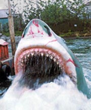 アトラクションの形式はTDLで言えば<ジャングルクルーズ>。 だいたいご想像の通りのアトラクションだと思います。意外性が少ない? 船の左側(列の先頭)に乗るとすぐそばでジョーズがガバッと来ます。 ビックリします。ポンチョを着てても靴が濡れます。気をつけましょう。 かあちゃん困ってました。 |