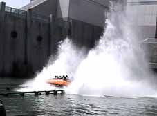 水上スタントショーですね。別に映画を見ていなくても楽しめます。 もちろん見ていたほうがショーの「時代背景」が理解しやすいとは思いますが・・・ 高さ10メートル以上の所から火達磨でダイブするシーンや、 水上飛行機が突然飛び込んでくるシーンなどみどころ満載。私は好きです。 開園時間の20分前に行ったら余裕でした。 ただし、このショーは真ん中のブロックがやはり良い席だと思いますので、 早めに行って並ぶ価値はあると思います。 真ん中の一番前が特等席か?ただしポンチョが必要。 前の方のブルーの席は真ん中に限らず、少々水をかぶる席です。 真ん中のブロックが一杯なら、左側のブロックに陣取ってはいかがでしょう。 どのブロックであれ、ステージ手前にある2つのタワーに気をつけて下さい。 中途半端な席に座ると、タワーが目障りです。 水上飛行機は左から飛び込んできます。(左の写真) |