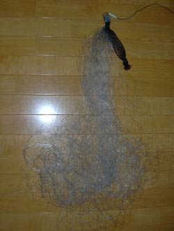 写真が錘と餌入れが付いたカニ網です。餌に寄ってきたカニを網に 絡まらせて捕ります。岩場では根掛かりするので使用不可です。