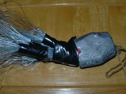 カニ網は4−5対の網の袋からなっています。これらが絡み合うと良くないのでほぐして使うのですが、ほぐしやすいように左の写真のように各袋の根元にビニールテープを巻いておきます。