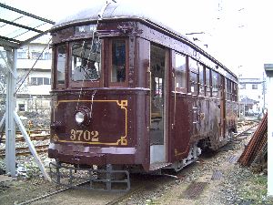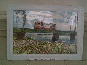 | 昭和2年生まれのモ3700系。休日祝日の昼間帯のみの運転で中には地方路面電車の写真や絵が飾られています。写真にある絵は加越能鉄道(現在は万葉線株式会社,また絵のような車両のカラーリングもない)の庄川鉄橋です。知っている風景なので色々あった写真の中から選抜。 |