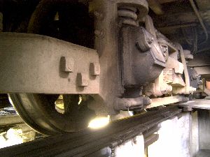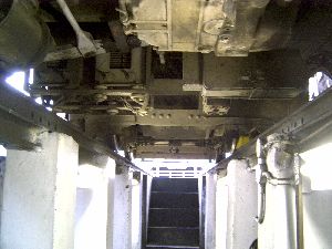 | 車体の下です。ジャッキで持ち上げるのでなく下に潜りこむというほうが正確ですね。エアーをためるところやエンジン普段は絶対見ることができないメカニカルなところは見る価値アリです。もちろんヘルメット着用で見学です。 |