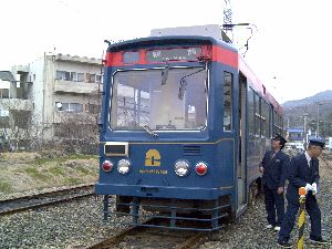 | これが運転した車両でかつて都電荒川線で使われたものです。名古屋陸運局では運転体験の許可が下りず国土交通省に申請して許可が下りたようで色々決まり事がありました。たとえば@車道に向かって運転体験をさせないA窓をあけないetc@はもし車道に出たら危険なので車両止めに向かって運転ということ。Aは体験と言っても通常運転のように窓をあけないということです。何かあれば全国規模でこのようなイベントはできなくなると思うので協力しなければなりません!!ちなみに運転距離は30メートルぐらいです。 |