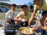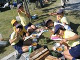雲ひとつない晴天! 10月の割には暑いくらいの暖かさ。 CS隊恒例の野外料理のメニューは? 1 火をおこし 2 肉を炒め 3 火が良くとおるよう切った野菜を入れ炒め 4 水を加えて沸騰させる 5 ルーを加えて少し煮込めば カレーの出来上がり ![]() ![]() 九合のご飯も焦げひとつなく,上手に炊けました。コツは? 〇水加減(飯ごうの目盛りを使えばよい) ◎噴き出したら火を弱くして20分 〇炊けたら逆さまにして,新聞紙でよくすすを落とすこと ![]() ![]() いただきます!!! |