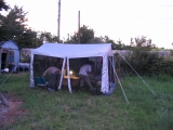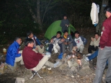 本体とサポート隊合流後は,楽しみの夕食。 ![]() 色とりどりのテントが建ちました。 食後は,焚き火を囲んで,今日を振り返る。「2回,川に落ちた人もいたね。」で,靴と衣服を乾かしている。 |
