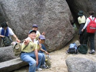 評価・反省 ・今回,適度な空き時間や休憩時間がとってあるものの,充実したプログラムが組んであった。 それぞれの行事が,時間どうり始まるかどうかが心配だったが,全て時間通りに始められたと思う。 スカウトが,よく頑張り,日ごろの訓育の成果が発揮できたのではないか。 ・リーダーの方々がいつも協力的で,チームワーク良く,スカウトに適切に指示を与えていた。 ・登山については,変化に富む天気の中,目的が達成できたのは,準備・協力・頑張り・ガイド・自然の家 のおかげ 天候等の条件がこのようなときには,ガイドが頼りになる。ガイドをお願いしておいて本当に良かったと思う。 ・スカウトは今回の登山で,装備のほとんどを使ったのではないか 登山に何が必要かが,体験できた 「そなえよつねに」の意味を実感 でも,まだまだこれから ・岐阜御嶽少年自然の家では,団体に1人ずつ所員がつき,適切なアドバイスをしてくれた。感謝 ・他団体との関係で,プログラムの調整を要することもあるが,むしろそれが幸いすることもある。 特にバードウォッチングが飛び入りで入ったが,御岳の大自然に触れることができ,大変良かった。 |