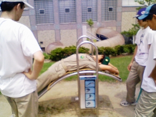 芝生広場で,BS隊長とH君は四葉のクローバを見つけました。 健康のための遊具が置いてある。