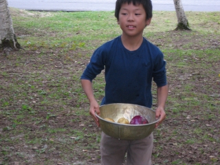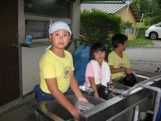 CS,BS隊は夕食の準備。まず,野菜を洗って。チキンカレー作り。