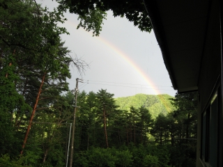 雨があがり,近くに虹がかかった。 とうもろこしを食べながら,虹をながめている----