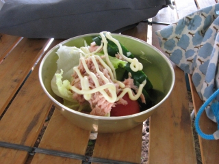 ・昼食は,タマネギとベーコンを炒め,ジャガイモを放り込んで牛乳(コンソメ味)で煮る(圧力釜使用)という簡単なもの。GOOD!協力してジャガイモを準備しました。