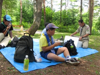 BS隊の野営地は木立の中。雨対策のブルーシート。 朝食は味噌汁とごはん。おにぎり用のご飯も炊く。