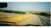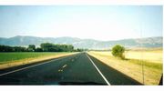 BIGHORN NATIONAL FOREST へ(I90からHwy.14をひたすら西へ)左:左の方に見えるのが対向車線という道幅の広いI90。写真のような平坦なプレイリーが延々と続く。左下:ハイウェイ14に降りれば,たまに左下写真のような開拓地を通り過ぎる。この辺りの人口密度は小さく,ここの郵便局の担当区域の人口は全米一少ないそうだ。 |