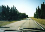 BIGHORN NATIONAL FORESTロッキー山脈に入りさらに西へ進む。針葉樹林が延々と続く。写真はもう少しで尾根というところ。 針葉樹林はほとんどがマツ科と思われる。 車の前を悠然と鹿(Mule deer doe)が横切る。 |