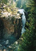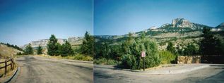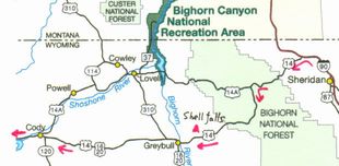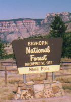 Shell Falls (シェル滝)ビジターセンターあり。(当然か) ここで,「ワイオミングの地質」「ワイオミングの動物」などの図書を購入。下: 花崗岩の層に乗った堆積岩の地層が正面に見える。写真奥の左側は大きく陥没していて,正面遠くの地層は左側で大きく折れ曲がっている。このような地層の折れ曲がり,断層,褶曲など実にダイナミックだ。 ここで言う「古代の地下室(花崗岩)」の上の堆積岩の層である。 ![]() |