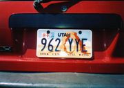 センターの駐車場の車のナンバープレート 州毎に描いてある絵は異なる。 これはユタ州のナンバープレートだが,同じユタ州でもスキーのプレートもある。 |