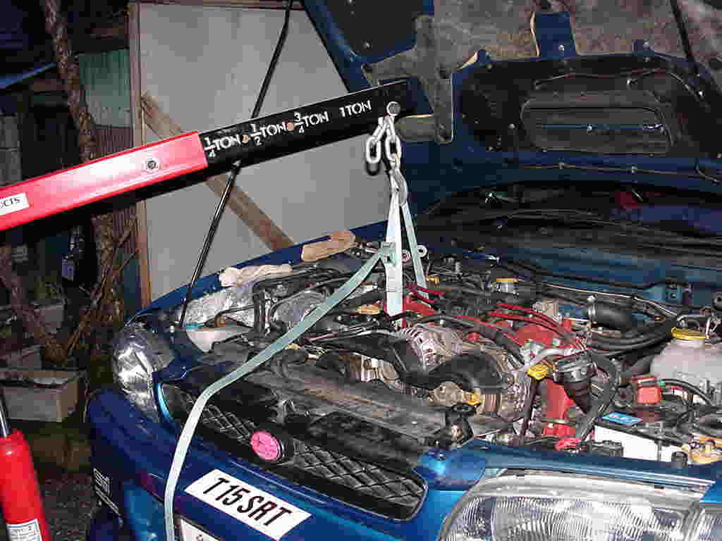 フロントパイプを外したらEXマニとタービンの接続ナットを外します。その後は車の下にもぐり、純正EXマニを取り外します。何個かに分割できます。右バンク側からタービンの方に立ち上がっている部分は、エンジン右側を5cm位持ち上げないと外せません。エンジンクレーンを右側のインマニにかけ持ち上げました。