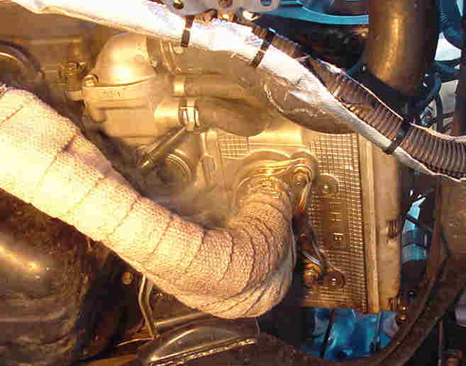 symsのEXマニは遮熱板がないためEXマニ付近のハーネス類は遮熱が必要です。あと、右フロントにあるキャニスターのバキュームホースの移設が必要になります。