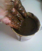 紅茶にカカ投入。 塊をつぶしながら溶かす。 |