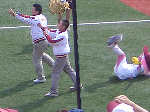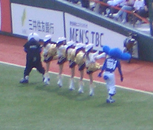 ライト側の応援で、カラスコ様と ドアラさんのラインダンス。 |