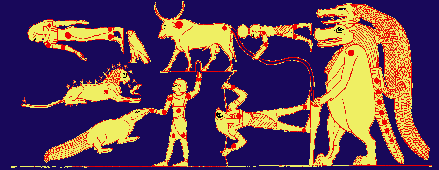 右の方で、鰐を背負っている直立した河馬が、トゥエリス女神。中央の牛と横になっている頭に円盤を乗せた人物が現在の北斗七星に相当すると言われている。 (河馬の方が大熊座であるという説もあり)。牛の下にいるホルス神は、牛に攻撃を仕掛けている。 また、左上の女神は、セルケト女神(通常、頭に蠍を載せた姿で表される女神)とされる。 |