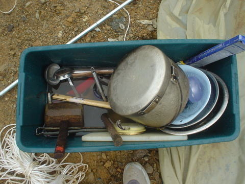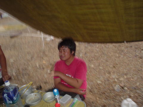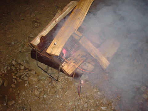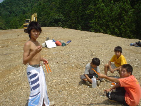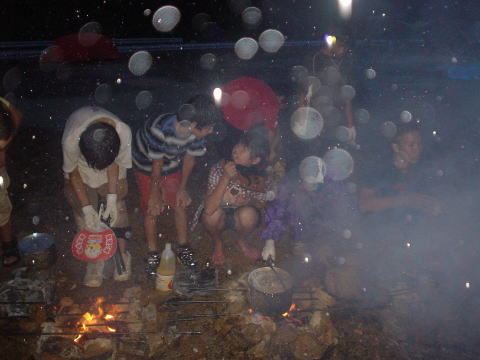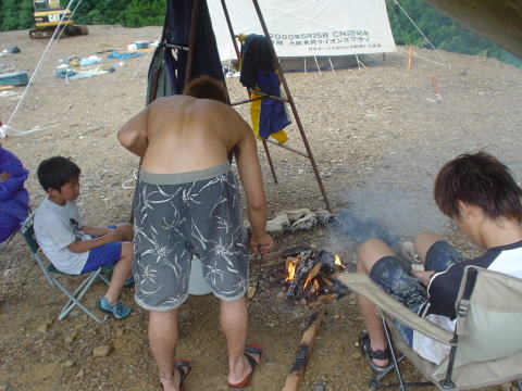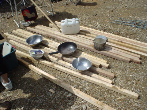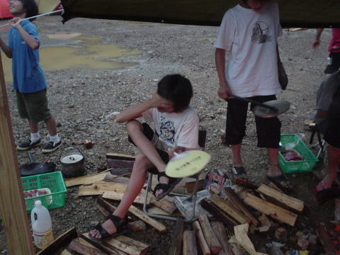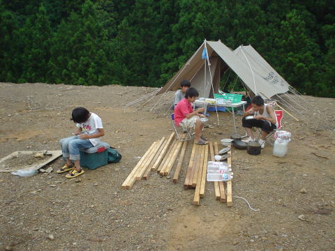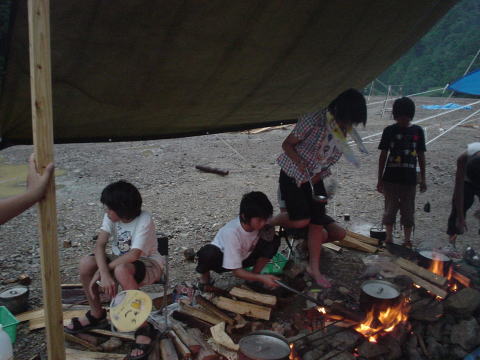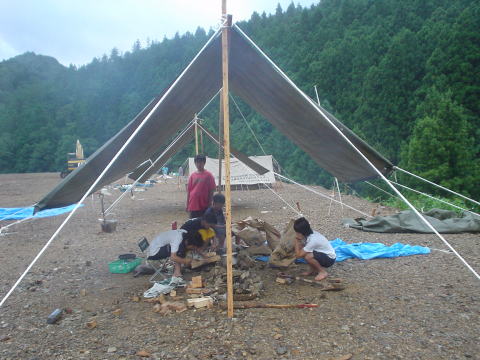 夕方には結構雨が降ってきたので、リーダーの作った屋根のしたにかまどを作りました。