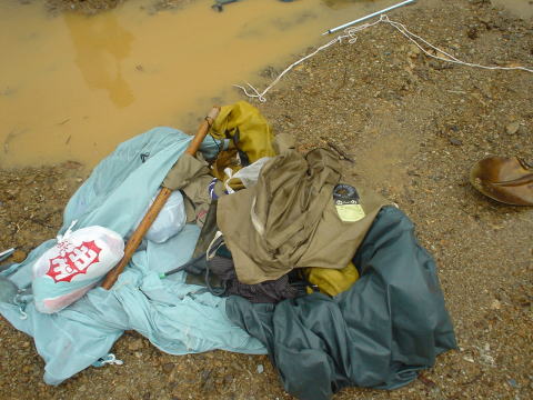 グランドシート(テントの床の敷物)を川で洗ってから干して