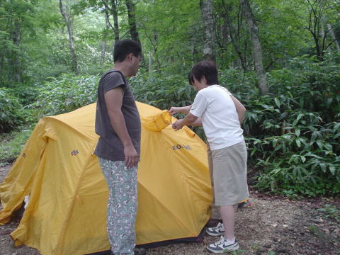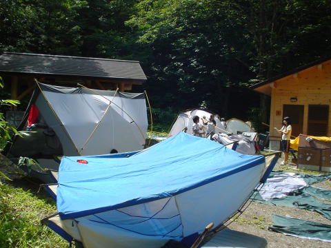 昨日の雨で濡れたテントはひっくり返して乾燥させます。