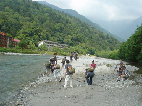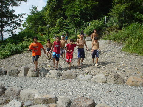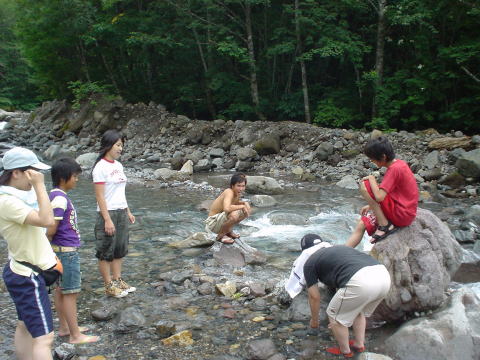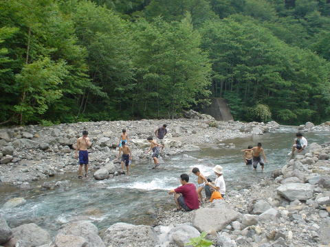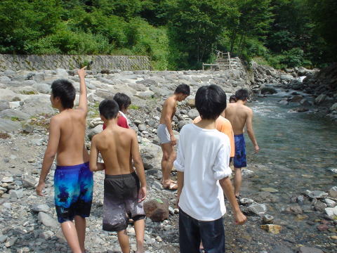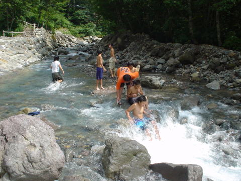 昼のプログラム。滝行はむりなのでただの川遊びです。