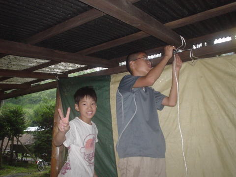 ↓濡れないようにテントの中から作業しているようです。