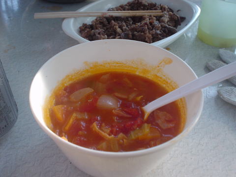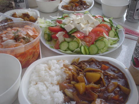 夜のメニューはサラダとカレーです。