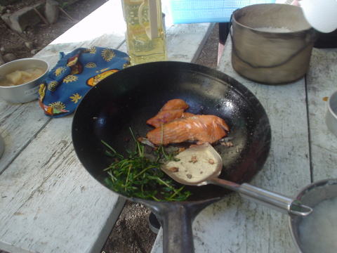 朝のメニューはサーモンの照り焼きと味噌汁です。