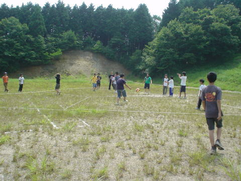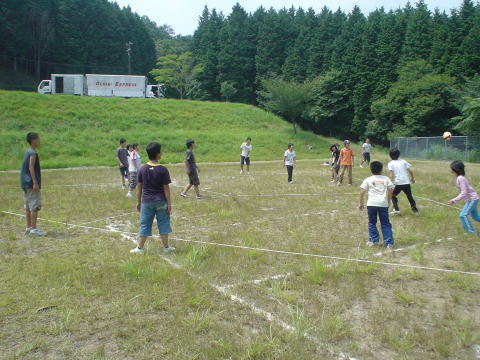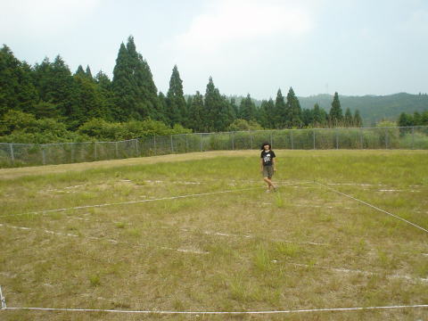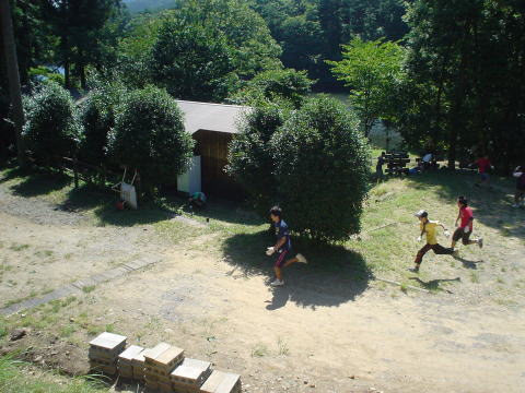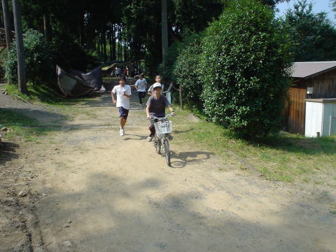 広場の真ん中においてある脚立を回って戻ってくるまでの時間を競います。