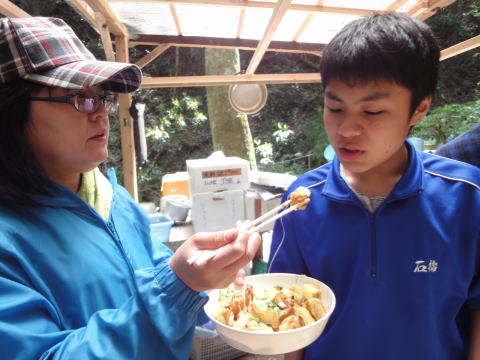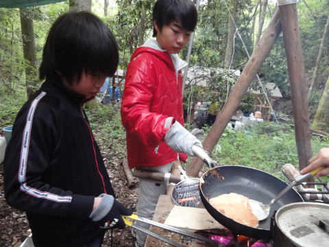 火加減を調節する係、フライパンを握る係、ひっくり返す係、
