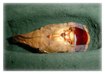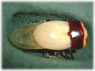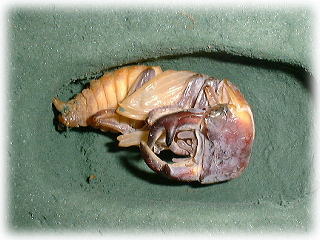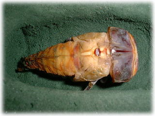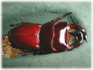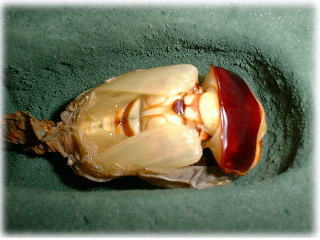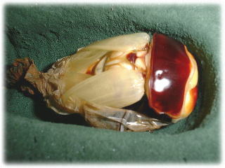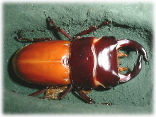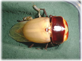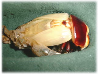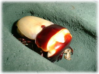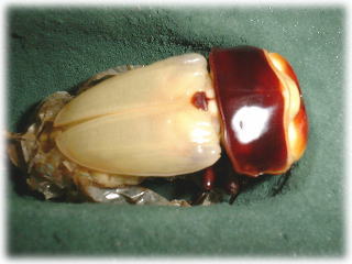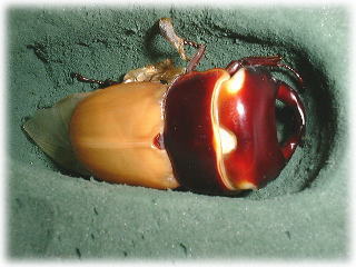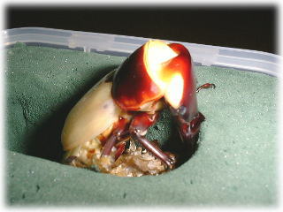 | 3月6日(月曜日)午後7時50分 会社から帰ってすぐに温室を見るとタイクルビ♂蛹 の背中が5mm位割れていた。 「やった羽化の瞬間がみれるぅ〜!!」 直ぐにデジカメを用意してまず1枚。 夕ご飯を食べながら数分おきにチェックし、 写真をパチ。 羽化不全もなく無事羽化しました。 大きさは極小の50mm位で大顎の長さが左右少し 違う等多少奇形気味だがオオクワ系ではおいらに とって初めての羽化なので大切な虫になりました。 |