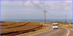 ★ハレイワからワヒアワへ 遂にNorthともお別れ、後ろをチラチラ振り返るとNorthの海が別れを惜しんでいるかのように白波を立てているのが微かに見える。そしてバスはホノルルに向い内陸部へと進んで行く。しばらくバスはどこまでも果てしなく続くパイナップル畑(写真左)の中を走り続けます。やがてパイナップル畑も終わりに近づくと左手にDole パイナップルパビリオンが現れます。(Top写真)結構ここでは旅行土産になりそうなものがたくさんあります。ワイキキで買ってきたマカデミアナッツのチョコレートなんかより、ずーっとハワイらしいお土産がたくさんあります。 |