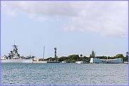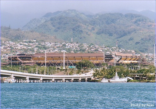 ★パールハーバー沿いを高速道路で走る バスはミリラニから遂にパールシティーまでやって来ました。しばらく街中を走っていたバスはパールハーバー沿いを高速道路で走り続けます。湾の右前方に微かにフォード島が見えてきます。フォード島のすぐ前には白いブリッジ形の慰霊碑USSアリゾナ記念館が見えてきます。(写真左)その隣には就役解除になった軍艦ミズーリが停泊しています。パールハーバーには、アリゾナ記念館、ミズーリメモリアル、ボウフィン サブマリン記念館(Top写真右下)と第2次世界大戦の記念碑が多数あります。ワイキキから20番バスで行く事が出来ますので是非とも訪れてください。あの太平洋戦争が何であったかを感じてみて下さい。 |