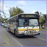 ★その他注意事項 車内では当然ですが飲食は禁止、ペットボトルでジュースなんか飲まない事。大きな荷物も持ち込めない、当然サーフボードも禁止です。濡れた服装での乗車もダメ。また、席の前方はお年寄りの優先席です。お年寄りや体の不自由な方には席を譲りましょう。また車椅子も乗りこめる作りになっており近くにいたなら車椅子の固定に手を貸しましょう。 バスの運行スケジュールは時刻表通りではありません。いわゆるハワイアンタイムなのです。ノースではバスが1本通過したら30〜60分まてば次が来る位に考えておいて下さい。 注意ではないですが自転車の持ちこみがOKなのです。バスの正面にキャリアーが付いておりそこに自分の自転車をフックしバスに乗り込むローカルの姿も見かけます。ハワイならではの光景って感じです。かなり日本人的感覚では自転車のフックの時間にイライラしますが、Take it easy!の気持ちで気長に待ちましょう。 |