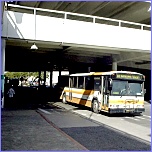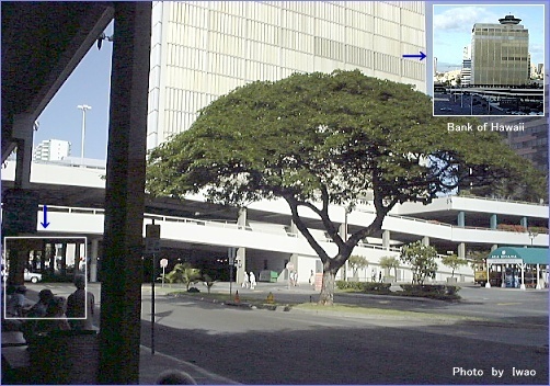 ★出発地点 まずは出発地点をご案内しましょう。前ページでご紹介した通り出発地点はアラモアナ、アラモアナSCの山側、コナ通りに面するBank of Hawaii ビルが目印です。(TOP写真参照)このハワイ銀行とアラモアナセンターを結んでいる連絡口の橋の下が目的のバス停、サバーバン・バスストップです。ここが出発地点となります。