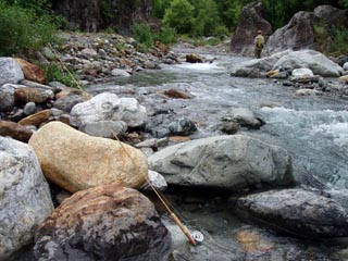 流れの下から、渓の中央まで魚を引き出して、下流に走ろうとするのをかわして