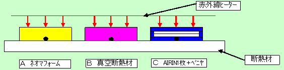 左図のように3種類の断熱材を並べ、上方約3cmから赤外線ヒーターで加熱。