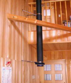 | シングルの煙突部分を壁面でささえて持たせています。薪ストーブの煙突は非常に高温となりますので室内での支えは危なくて見るに耐えない。 | 壁面への支えを無くし、さらに煙突の傾きを修正煙突の抜けを修正する。 | |||||
