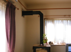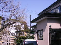 鉄柱内部で、排煙が冷やされ空気及び排煙が重くなりスムーズに排気が出来ない状態と同時に室内に戻る。住宅自体は、高断熱高気密住宅でした。 |