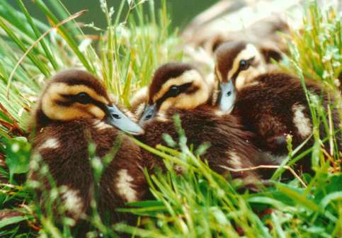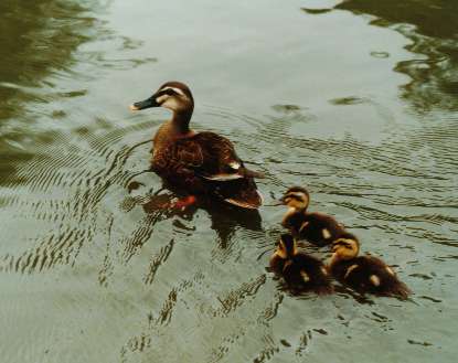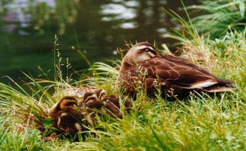 | 東京世田谷、馬事公苑の池に 住みついていた、カルガモの親子です。 |