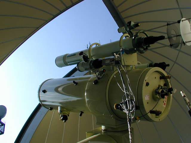 天文通信館隣の天体望遠鏡 太陽のプロミネンス(炎)、黒点を 見せてもらえます。 天文台は、入場無料。 |
