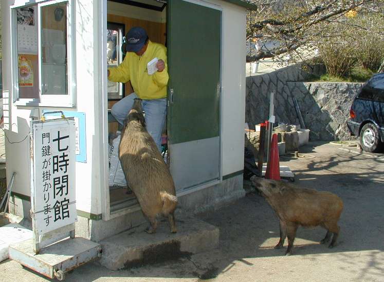 | 駐車場まで、イノシシが出てきます。 野生のはずなんですが、このように、慣れてます。 イノシシが怖いのは、手負いの時 ? |