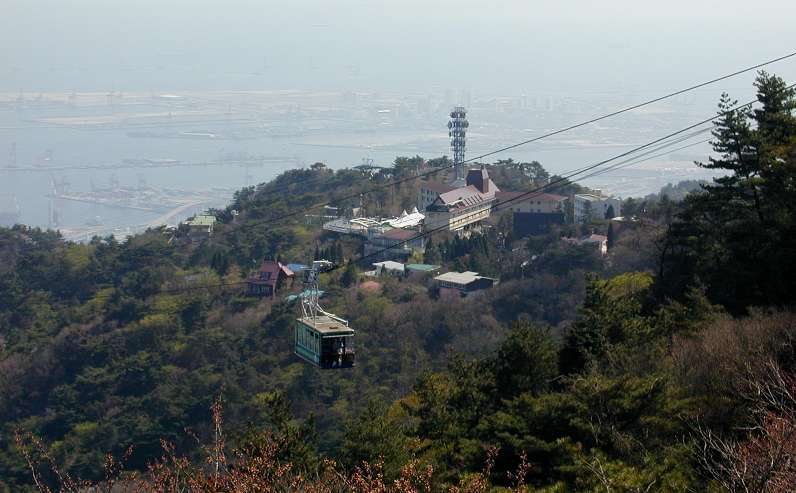 六甲山頂駅に近づくロープウエイ。 下の屋根は、ジンギスカンパレスの屋根。 六甲山は、ジンギスカンが名物。 ロープウエイは、中腹まで。 そこからは、ケーブルカーに乗り継いで、 麓へ降ります。 |