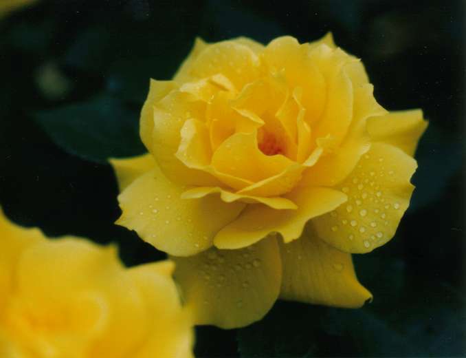 神代植物公園のバラです。 水滴は自然のもの 。 (霧吹きで作ったものではありません) 。 バラの花は、遠目ではきれいでも、 近づくと、開きすぎたりして 花びらの均整がとれていないものも多く、 形のいいのになかなかめぐり会えません。 |