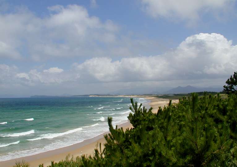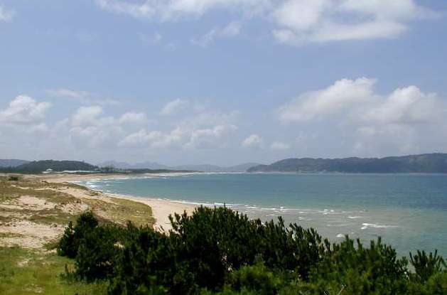 志賀島の外洋側の砂浜です。右が志賀島。 左のカーブの先部分が、島につながる 海の中道の一番細い部分。 |
